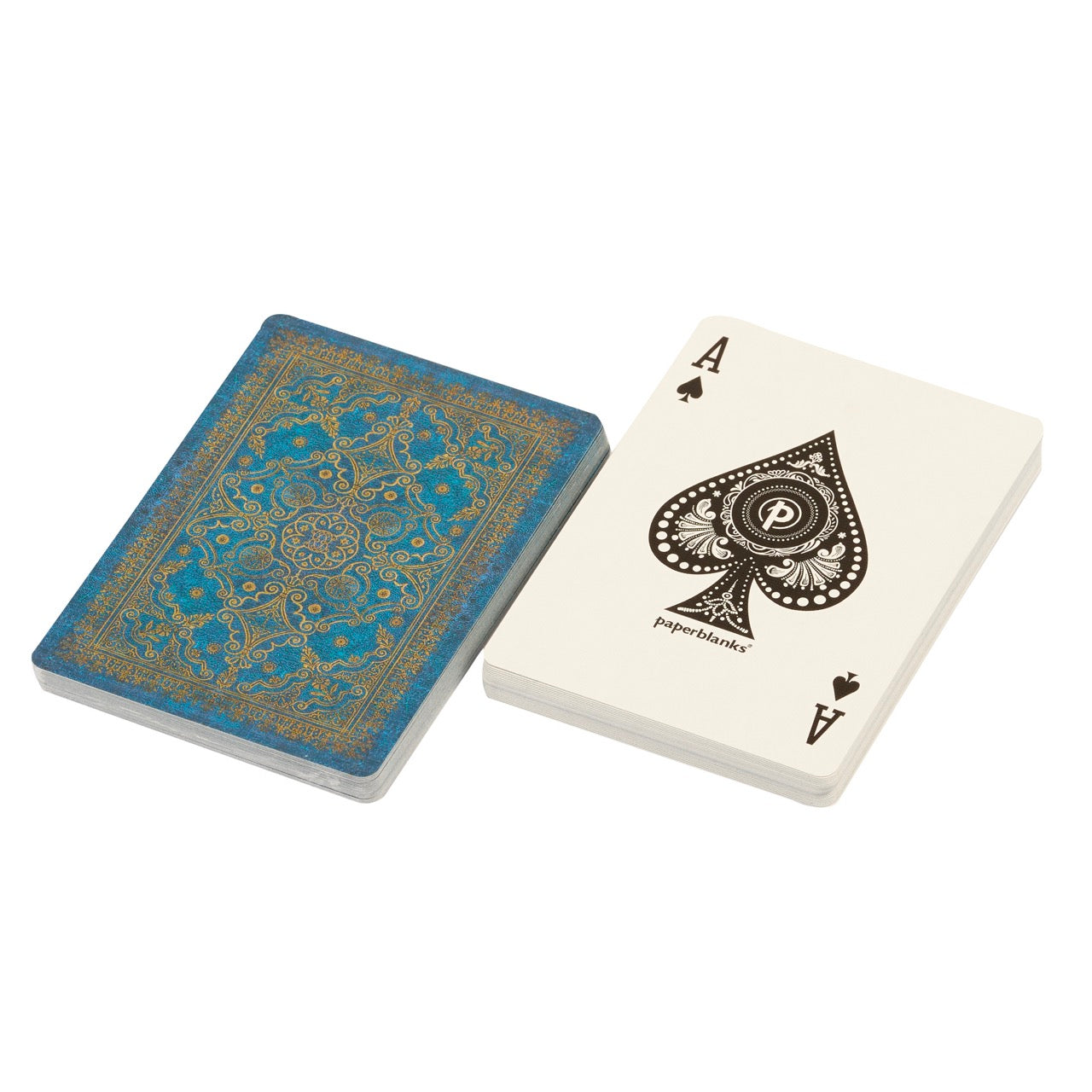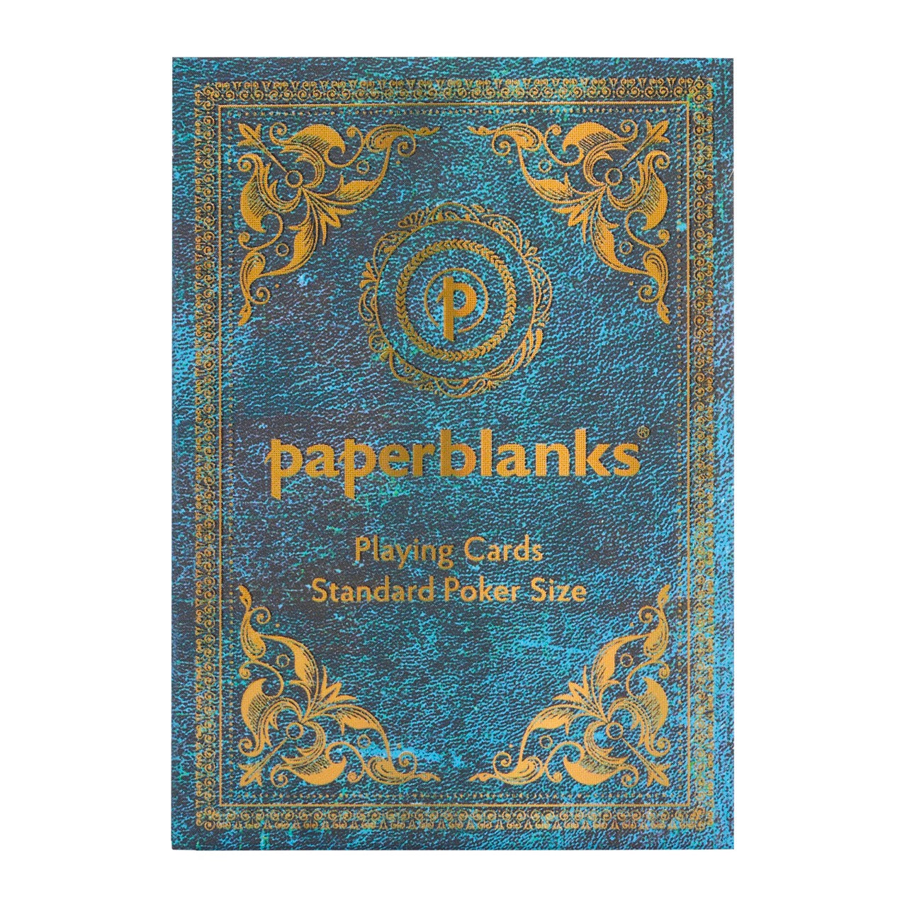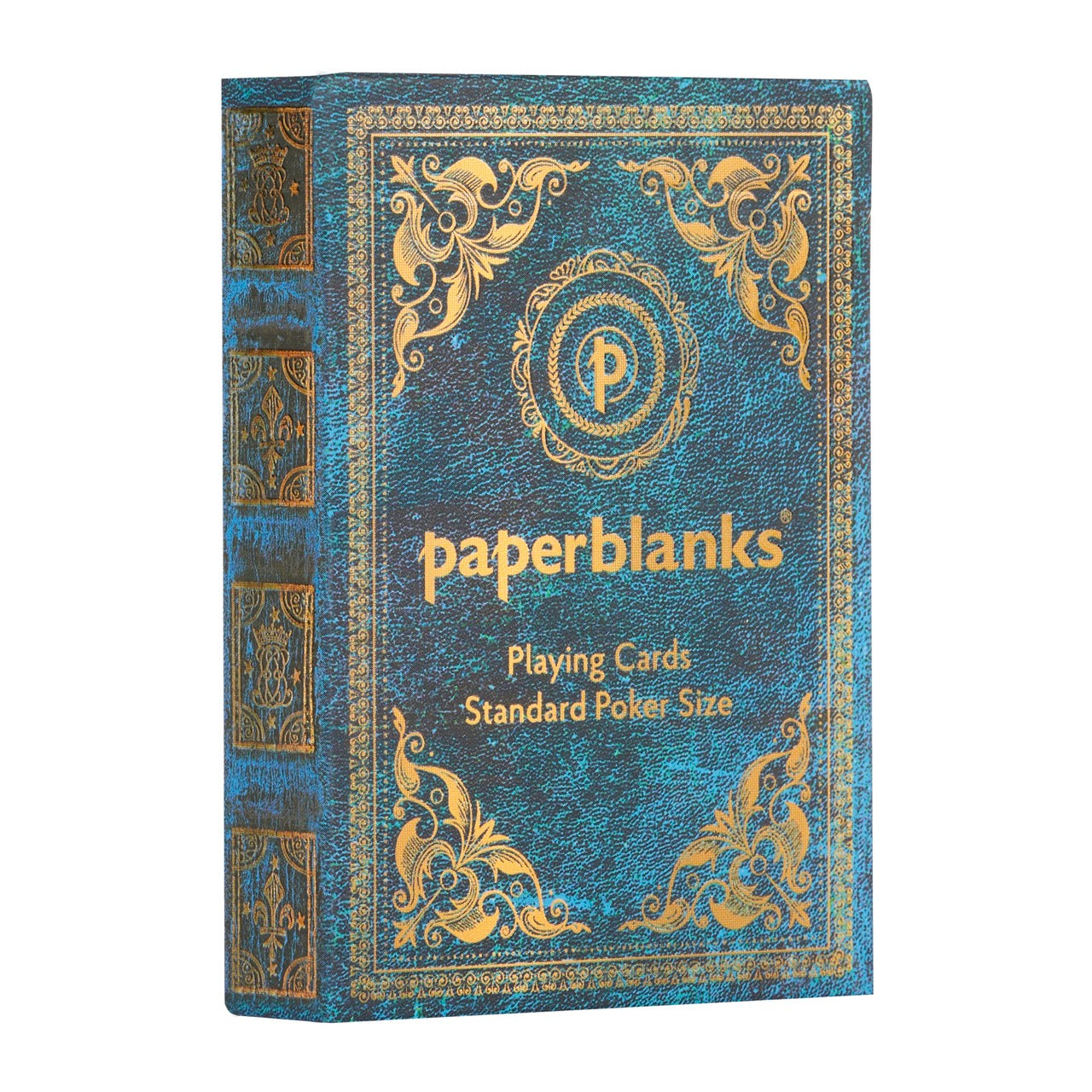 Azure – Equinoxe gjenskaper et gullforgylt bokbind fra 1688 på et klassisk kortstokkdesign. Den dype blå tonen og metalliske detaljene gir spillet et preg av både eleganse og historie.